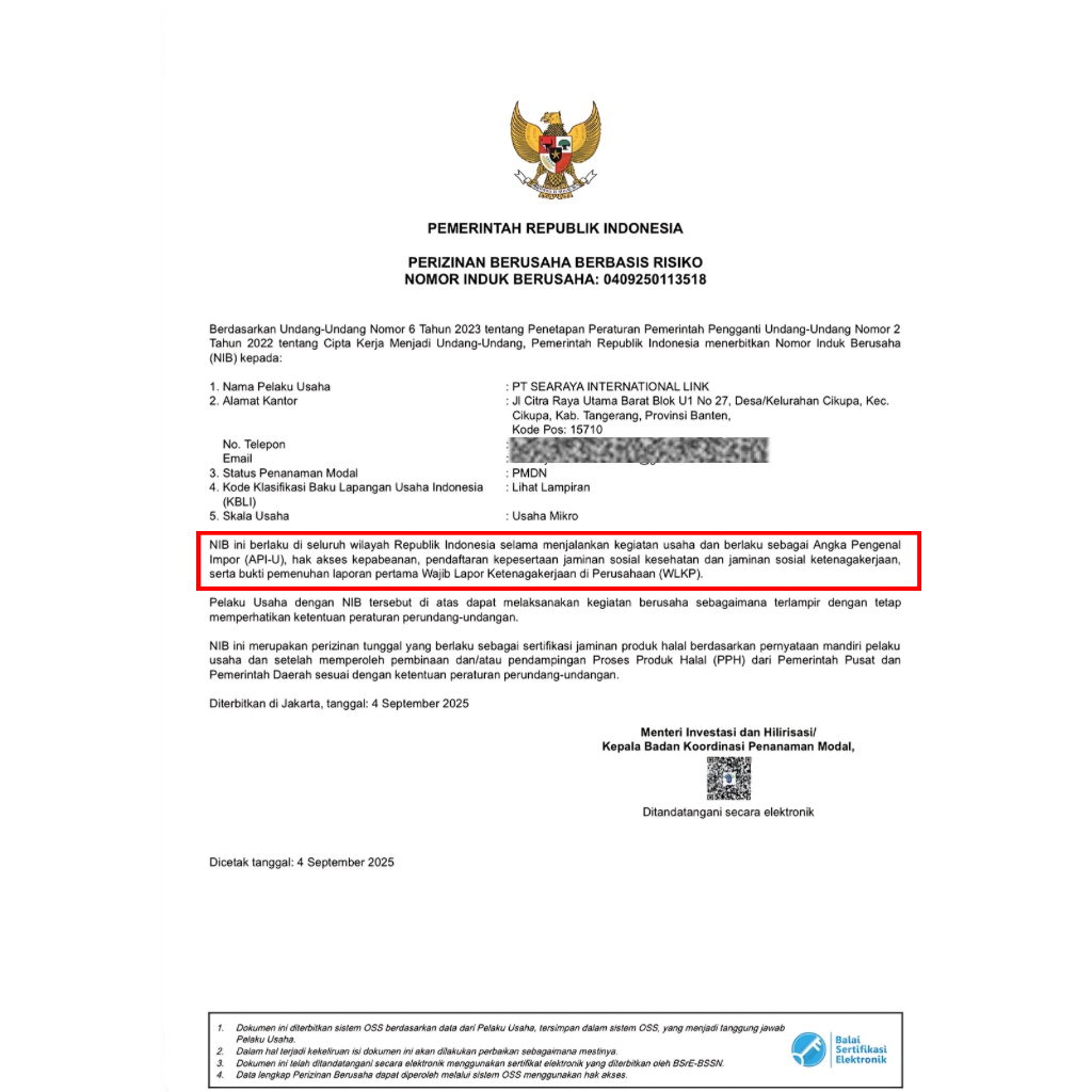 Legalitas ini memastikan bahwa setiap kegiatan impor yang dilakukan Searaya sepenuhnya sesuai regulasi pemerintah, transparan, serta dapat dipertanggungjawabkan. Dengan dukungan izin resmi ini, kami berkomitmen menjadi mitra terpercaya dalam menyediakan solusi impor yang aman, legal, dan profesional bagi setiap klien.
